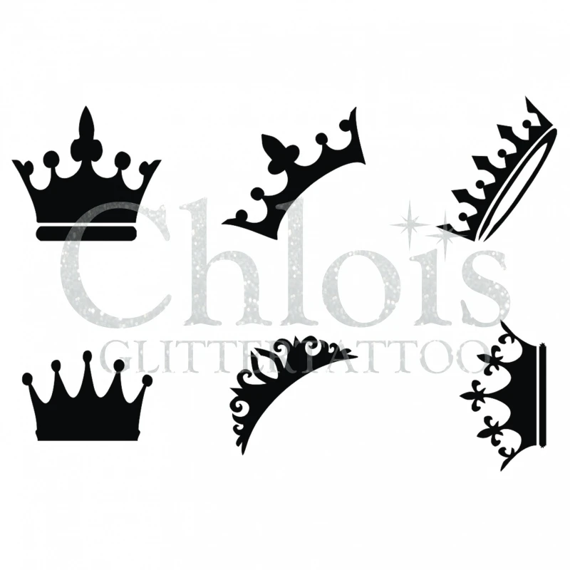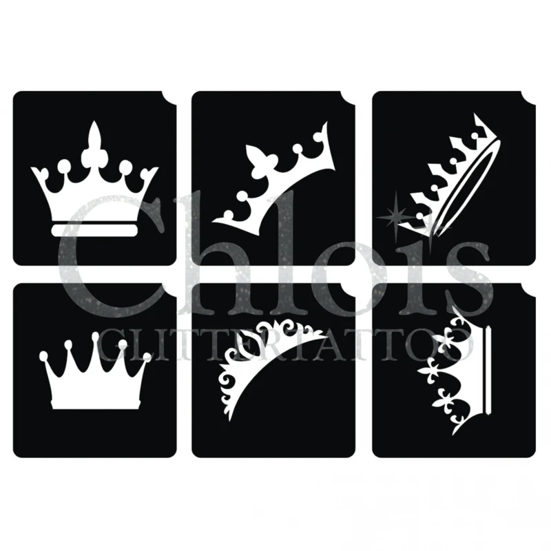 Chloïs Glittertattoo Sjabloon Crown (6 mini stencils) zijn 6 verschillende zelfklevende mini sjablonen in hetzelfde thema, speciaal voor het maken van glittertatoos. Extreem simpel in gebruik en super hygiënisch omdat ze per stuk aan twee kanten beschermd zijn. Wij raden je aan om de sjablonen maar eenmaal te gebruiken, met oog op de hygiëne, want er blijven dode huidcellen achter op de klevende kant van het sjabloon als je deze verwijderd. De lijm op het sjabloon is echter sterk genoeg om meerdere keren opnieuw te blijven plakken, zou je ze voor trainingsdoeleinden willen gebruiken.