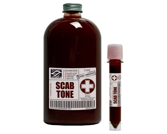 Scab Tone, EBA Transfusion Blood Vails, EBA Transfusie Bloed Lijn het mooie diepbruine korstige bloed van European Bodyart. Je kunt voor veel omgevingen dit bloed goed gebruiken, denk aan zeer vochtige ruimtes, zwembaden, warme haunted houses en nog veel meer. Scab is een diepbruin korstkleurig bloed. Het heeft een dominante bruin/gele tint. Scab tone kan alleen worden gebruikt om echte bloedkorsteffecten te creëren of gemengd met andere transfusiebloedtonen voor het aanpassen van de schaduw. Dit zorgt voor een heel ander spectrum van verschillende bloedtonen zoals drogen, oud of verouderd bloed.