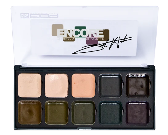 Encore™ Alcohol Activated Palette – Contour wordt geleverd met EBA’s kenmerkende magnetische hervulbare behuizing en tien kleuren alcohol make-up. De kleuren in dit palette zijn N1, C1, C2, Raphite, Maroon, Henna Brown, Seaweed, Gren, Oil, Aged, Tattoo & Intense Purple.