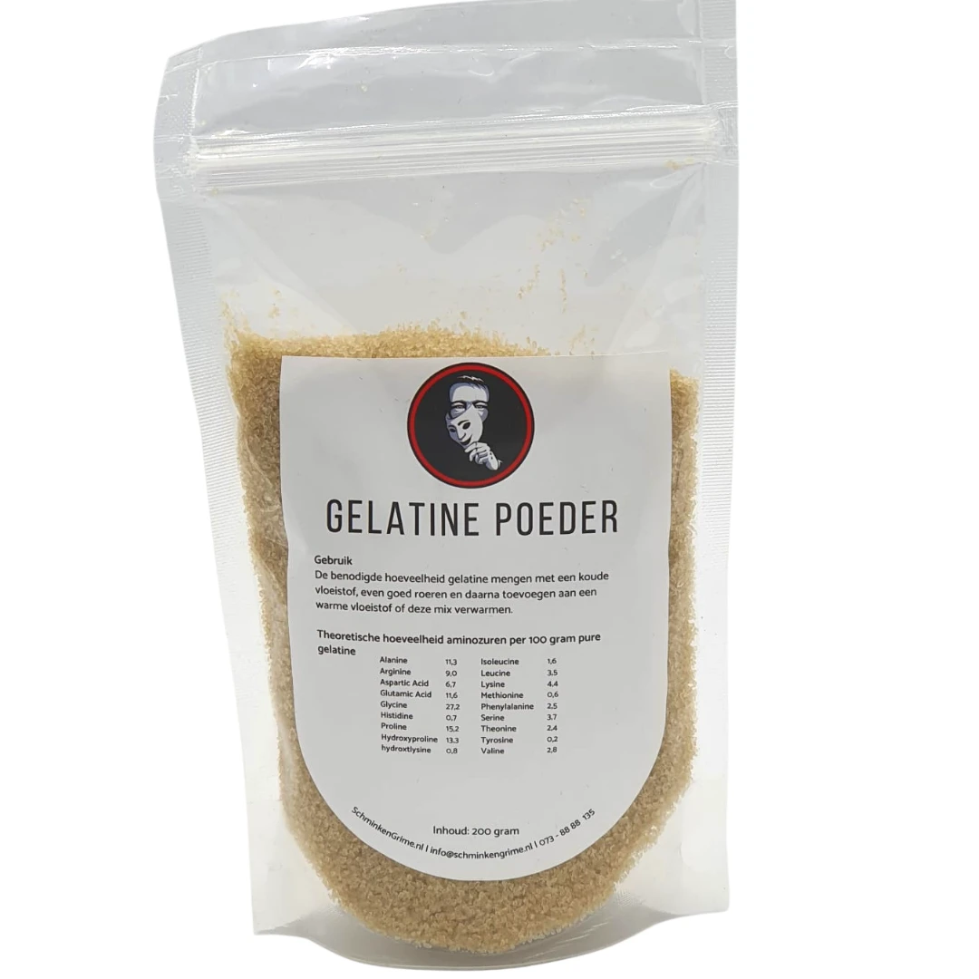 Deze gelatine is perfect voor het maken van je eigen Special Effects Gelatine. Met de zelfgemaakte gelatine kun je direct op de huid werken maar je kunt deze ook gebruiken voor het maken van prosthetics. Zorg ervoor dat je de gelatine goed oplost voordat je deze gaat gebruiken. De gelatinekorrels kunnen drie tot vier keer zijn eigen gewicht opnemen. Mix de gelatinekorre in een koude vloeistof en laat ze ongeveer 30 minuten wellen. Verwarm ze hierna au bain-marie tot de korrels volledig zijn opgelost.