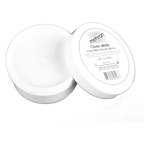 Mehron Clowns White – 200gr. is het meest verkozen product door professionele clowns en mimespelers door de kwaliteit en goede dekking. Deze super gladde en ultra witte crème dekt efficient zonder uit te drogen en te barsten zelfs onder de meest extreme condities tijdens het optreden. Mehron gebruikt voor dit product een hoge concentratie titanium dioxide en heeft hiermee een gladde en eenvoudig op te brengen schmink gecreeerd.
