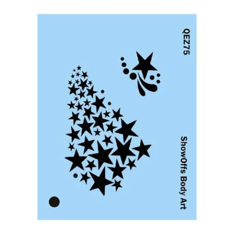 ProAiir QuickEZ Shooting Stars sjabloon is een super handig schminksjabloon (airbrushsjabloon) gemaakt door ProAiir om je werk te versnellen. Met deze handige van maylar gemaakte sjablonen, breng je in een handomdraai textuur aan in je schmink en bodypaint werk. Je voorkomt ellelange wachtrijen bij het schminken of een vermoeid model bij het bodypainten. Deze wil je dus zeker in je airbrush-kit of schminkkoffer hebben zitten.