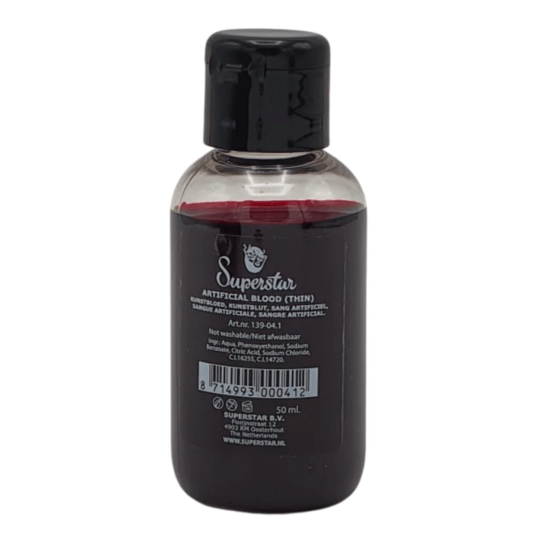 Dit bloed is niet uitwasbaar en wat moeilijker afwasbaar van de huid. Superstar heeft het bloed compleet vernieuwd. Het is ook uitermate geschikt om bloederige kleding mee te maken.