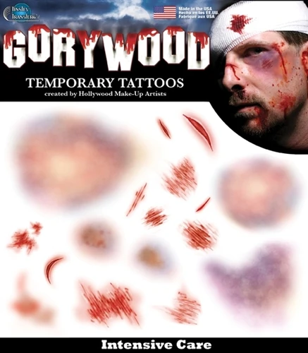 Intensive Care bevat kneuzingen, schrammen en verwondingen die individueel kunnen worden toegepast of gegroepeerd. Deze tatoeages zijn binnen enkele minuten aan te brengen en zien er op de huid waanzinnig realistisch uit. De tatoages zijn veilig, niet giftig, hypoallergeen en gemakkelijk aan te brengen met water en te verwijderd met alcohol of babyolie.