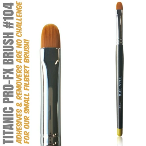 Titanic Pro-FX Small Filbert Brush 104 een penseel speciaal ontworpen voor de Special FX Makeup artiest. De haren van het penseel zijn met een speciaal ontwikkelde lijm vast gezet zodat de lijm die de haren bij elkaar houdt niet oplost en je met een gerust hart deze penselen kunt gebruiken in je Special FX werk. De productie van deze penselen gebeurt etisch verantwoord. De haren zijn synthetisch en veganistisch. Je kunt dit penseel gebruiken voor het aanbrengen en verwijderen van prosthetics en het kleuren ervan. Multifunctioneel dus.