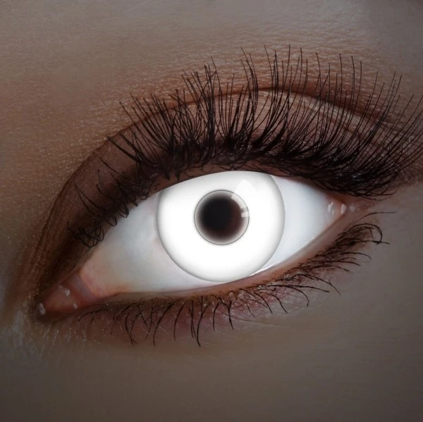 Deze UV-contactlenzen in het wit zijn uitzonderlijk en iets dat zeer weinigen kennen. Stel je de mensen om je heen voor wanneer je een disco of club binnenstapt en je ogen in helder wit oplichten als bij toverslag. Het zwart van je pupil werkt in schril contrast met het wit en draagt nog meer bij aan het effect. Met deze UV-lenzen in wit zijn de eyecatchers op elk feest en iedereen wil weten waar je de lenzen hebt. Met de witte UV-contactlenzen heb je de ultieme aanvulling op de blacklight-make-up. De grappige lenzen schijnen in het zwart licht in een helder wit en zijn de perfecte kostuumaccessoires, waarmee je op Halloween de absolute blikvanger zult zijn.
