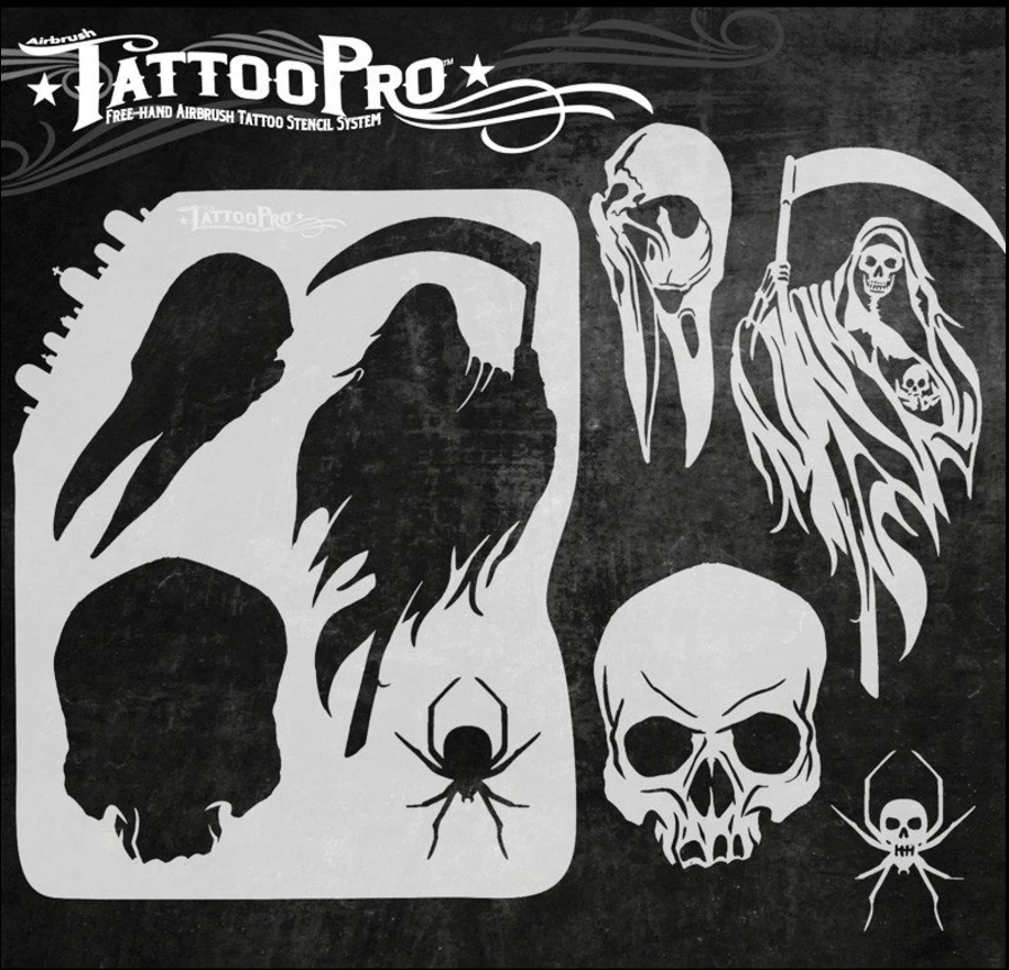 Wiser’s Airbrush TattooPro Stencil – Grim Reaper zijn Airbrush sjablonen speciaal ontworpen door Bodypaint en Graffiti artist Wiser Oner.