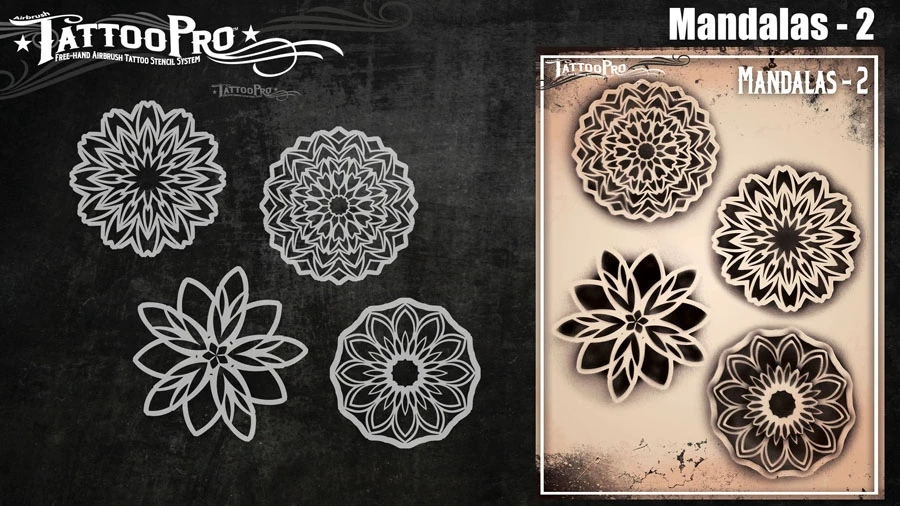 Wiser’s Airbrush TattooPro Stencil – Mandala’s nr. 2zijn Airbrush sjablonen speciaal ontworpen door Bodypaint en Graffiti artist Wiser Oner. Van de sjablonen kun je zowel de positieve als de negatieve delen gebruiken, als je ze uit het vel drukt. Eindeloos te combineren met de andere TattooPro stensils, zodat er iedere keer weer een originele Airbrush Tattoo ontstaat.